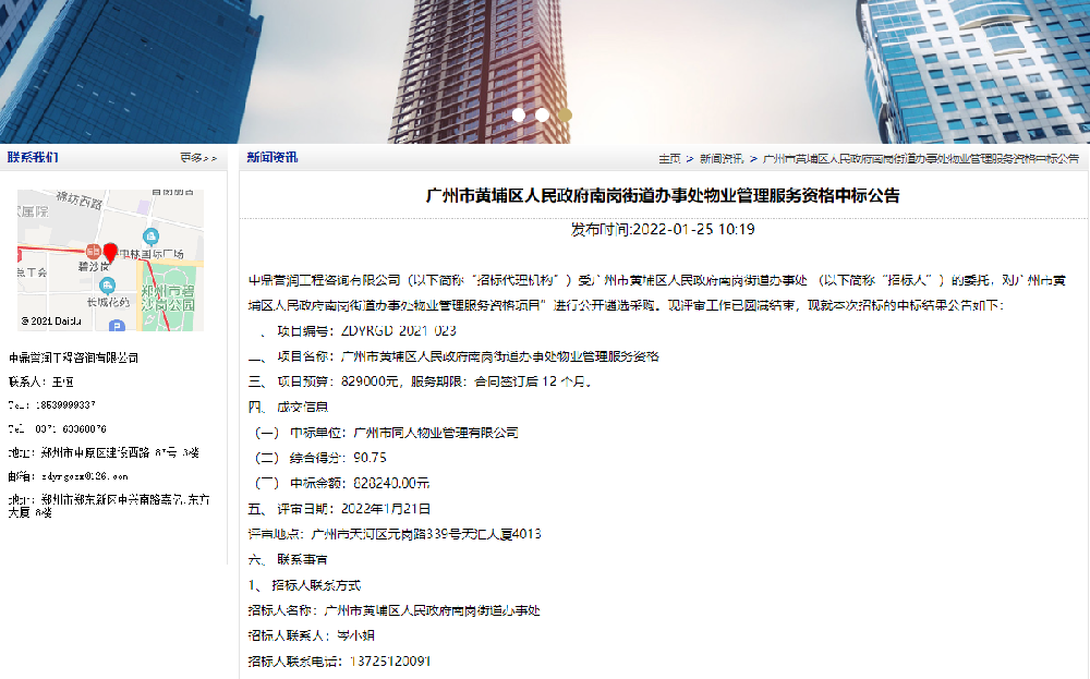 廣州市黃埔區人民政府南崗街道辦事處物業管理服務資格中標公告